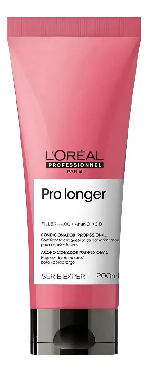 Condicionador L'oréal Professionnel Pro Longer 200ml tratamento profissional para cabelos longos com pontas finas ou danificadas ajuda a fortalecer a fibra capilar reduzir quebra e pontas duplas devolve densidade às pontas proporciona fios mais macios sedosos e fáceis de pentear tecnologia Filler A100 e aminoácidos que preenchem a fibra capilar deixando o cabelo mais resistente alinhado e com brilho saudável